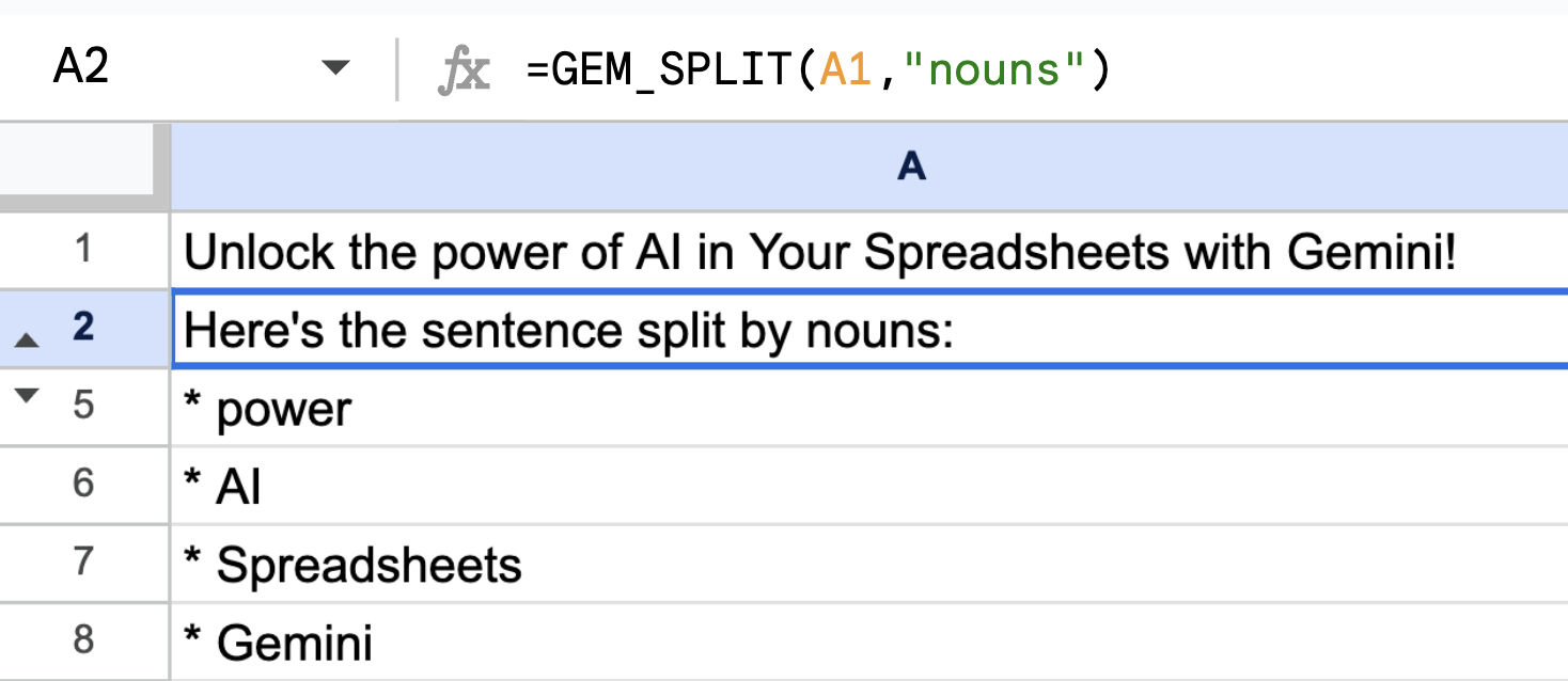 Create a Google spreadsheet and select Extensions > Gemini for Sheets and Docs. You can use the example template to follow along.